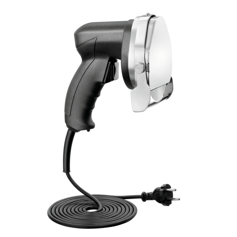 La lame à disque métallique durci amovible coupe la viande en quelques secondes. Manche en métallique léger pour une utilisation aisée. Transformateur et cordons fournis. Pour une utilisation peu intensive uniquement.