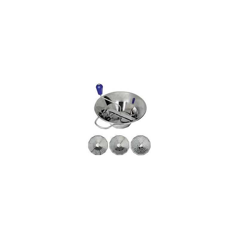 Il est livré avec 3 grilles interchangeables de 2, 5 et 7 mm de diamètre, pour varier l'épaisseur de la purée de pommes de terre, carottes, navets, etc...