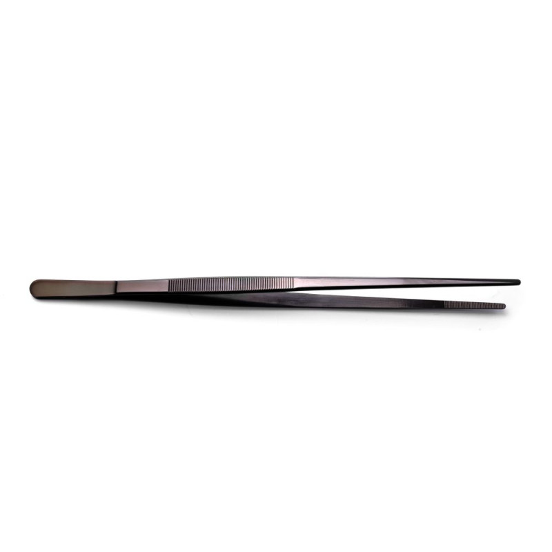 Les dimensions des différentes pincettes sont les suivantes : pincettes droites de 23 cm, pincettes incurvées de 20 cm et pincettes décalées (sushi) de 21 cm. La cuillère à dessin mesure quant à elle 22,5 cm tandis que la petite cuillère atteint une longueur de 15 cm. Enfin, la spatule mesure 19 cm.